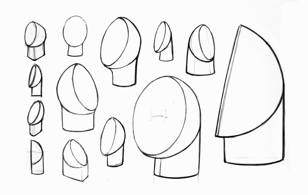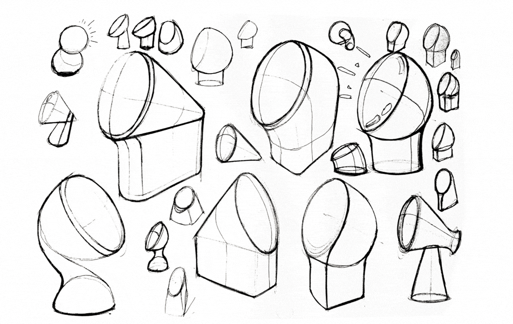 It started the usual way, with sketching. I had an initial idea of combining a traditional dome shape with a simplistic geometrical base shape. The rationale was to employ traditional shapes present in modern and contemporary interior objects, to set a limit for the product's complexity. It should look like a design table lamp, not a sci-fi movie prop.