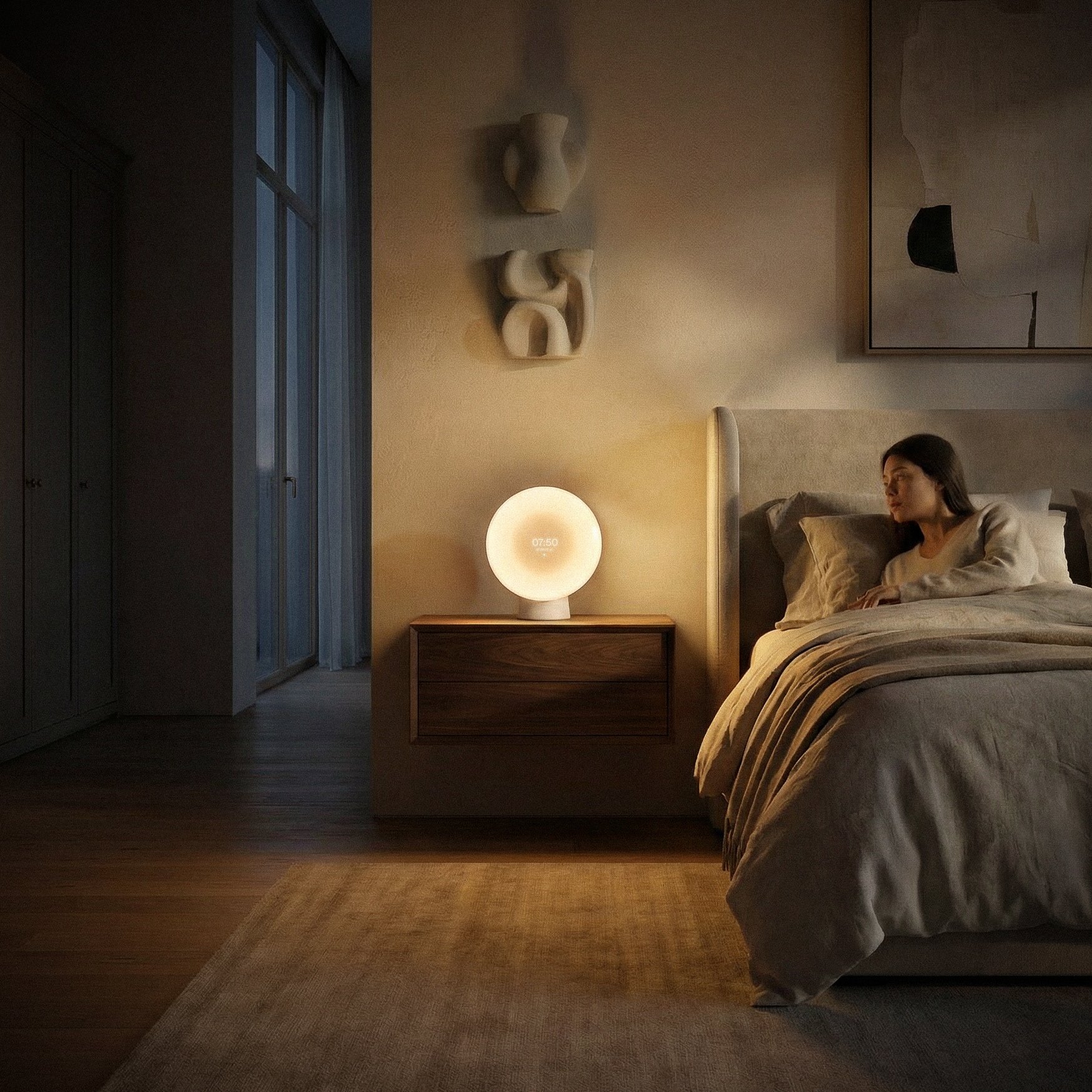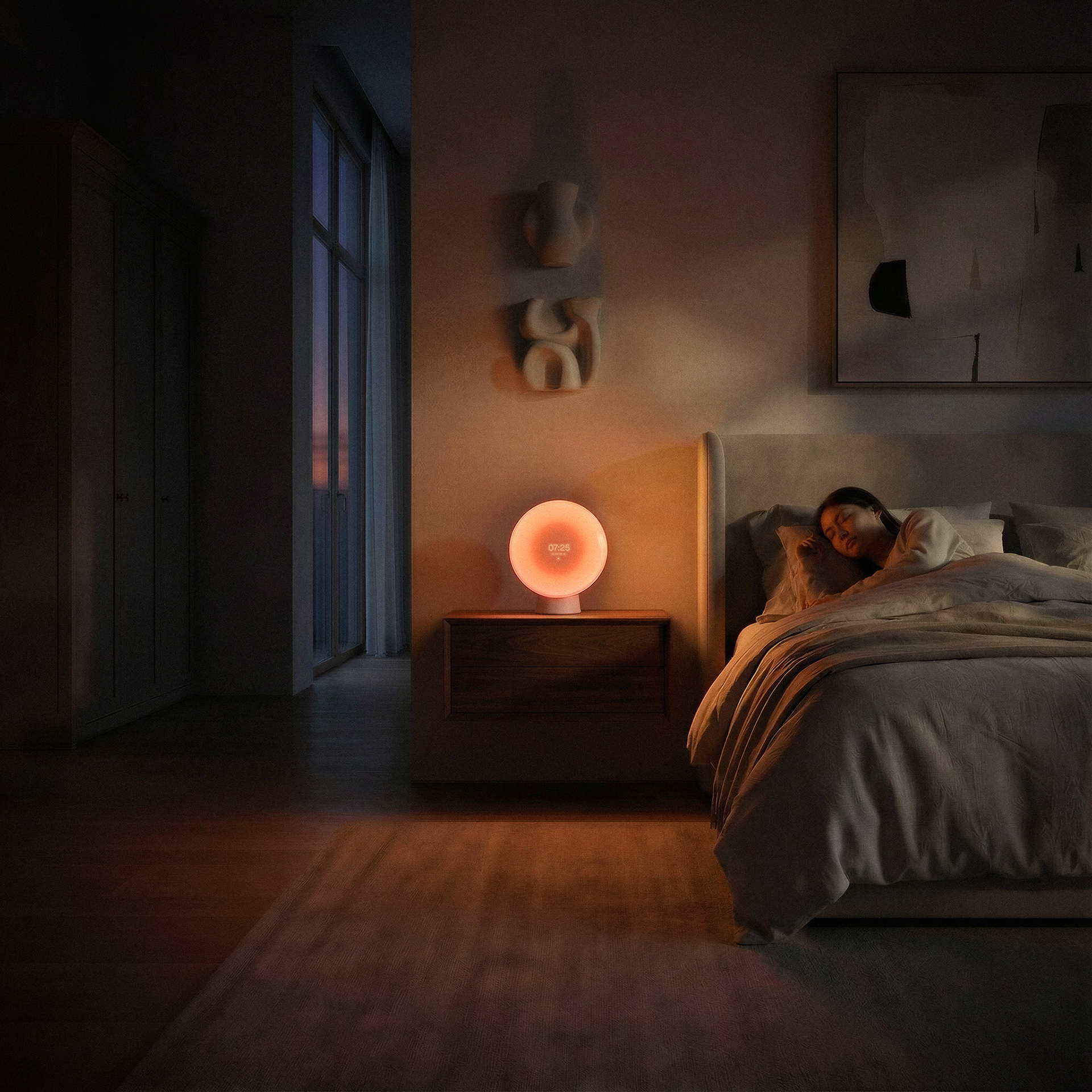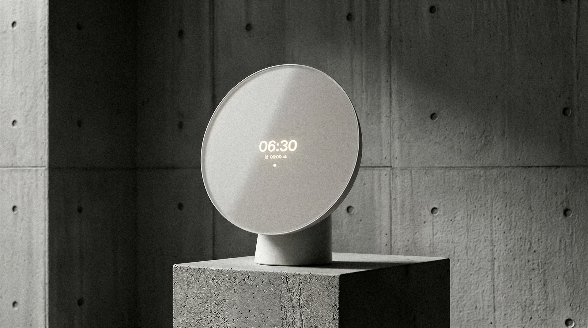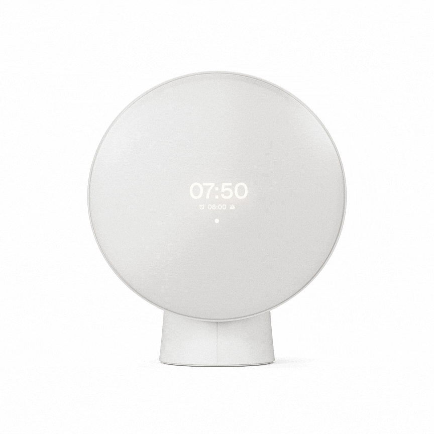 A key design driver behind Liven was creating a smart sunrise alarm clock without overtly futuristic or "smart" character. The goal was to find a balance between a smart tech product and a design object, a quiet harmony between aesthetics and technological function.
